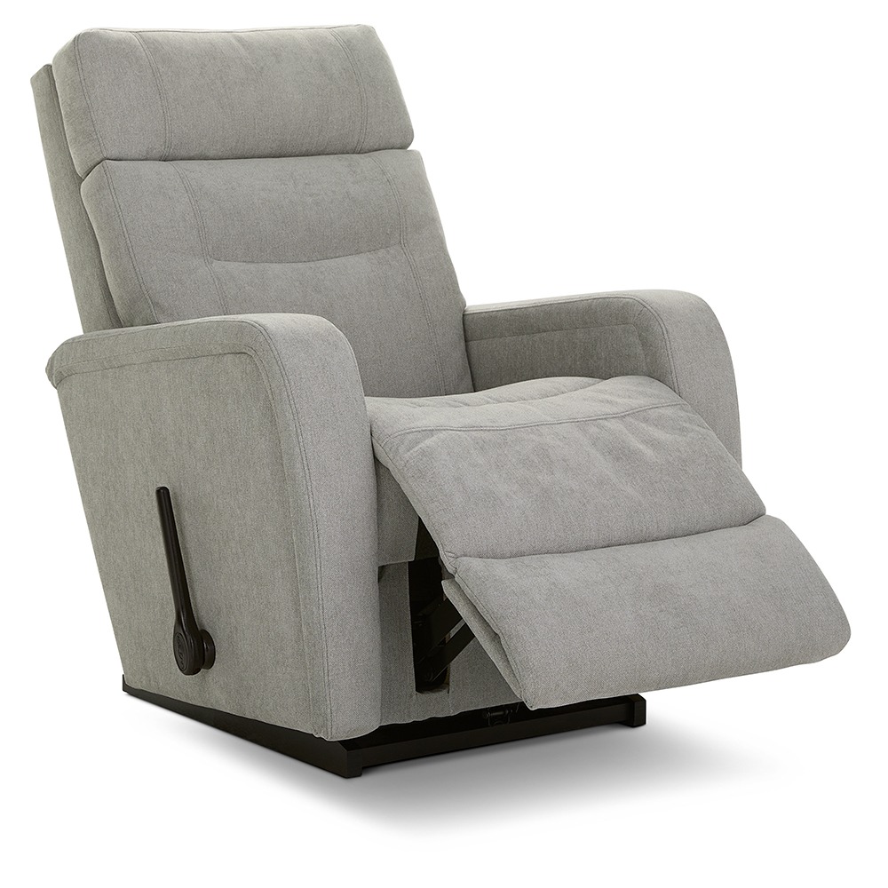 Looking for reclining comfort with contemporary style? The Baron Rocking Recliner fits the bill with modern lines, sleek track arms and a tall foam back that gives it a neat and structured look. The ultra-plush chaise seat and legrest cradle the body in a continuous zone of comfort. Simply use the convenient handle on the outside arm to raise the legrest for reading, relaxing or watching TV. When you’re not reclining, it’s a relaxing rocker with a smooth, graceful motion. Make it yours with your choice of fabrics and available upgrades.