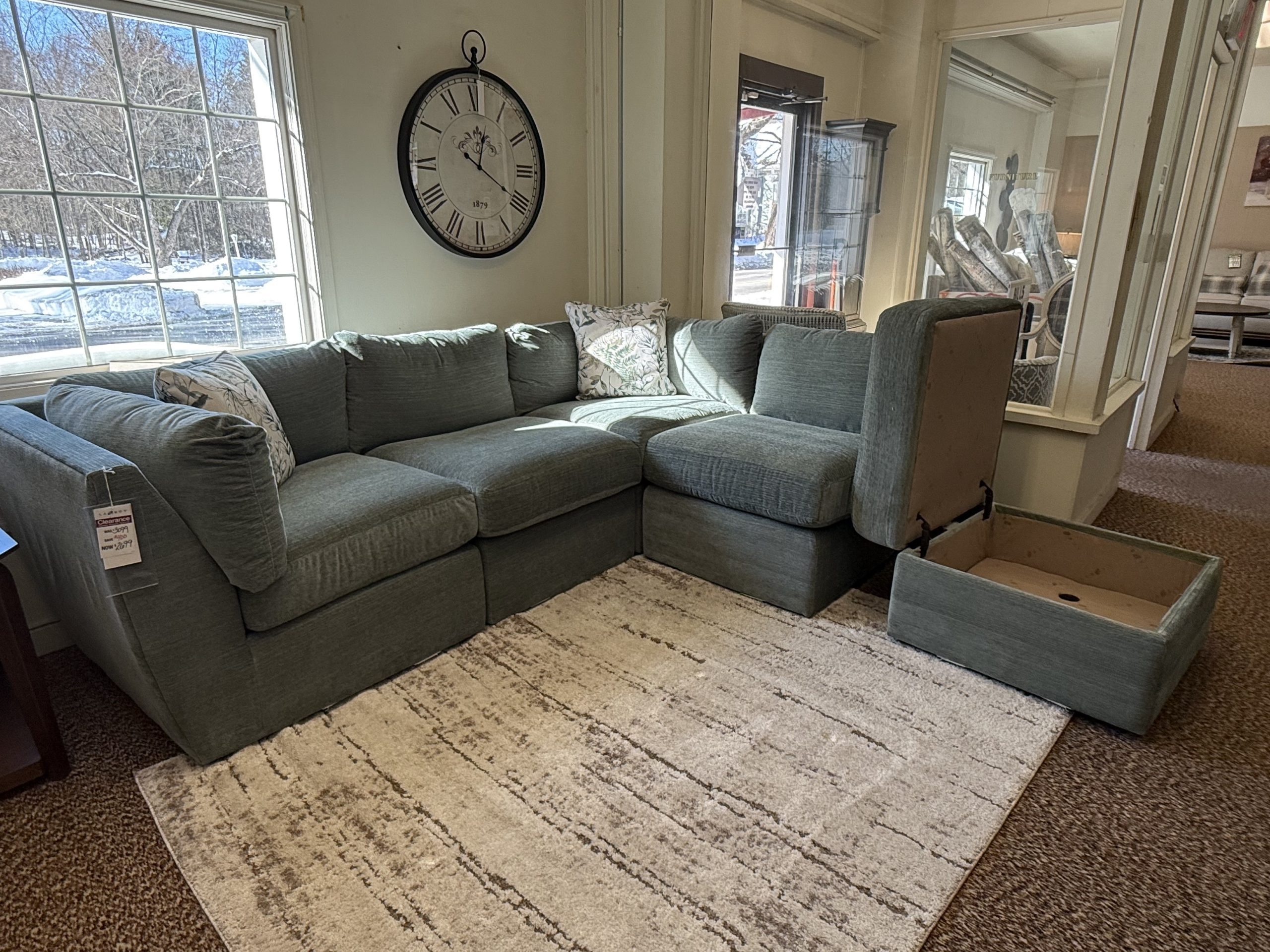 FLOOR SAMPLE SALE! SECTIONAL MARKDOWN WITH STORAGE OTTOMAN: The Montrose is the coziest spot, in the center of the action! You can completely rearrange each module to make it larger or smaller using the hidden connectors. The ottoman also has hidden connectors that you can attach to the sectional making a longer chaise end, or use in the middle of the area so everyone can share! Price includes 2 corner pieces, 2 middle pieces, the storage ottoman and the toss pillows.